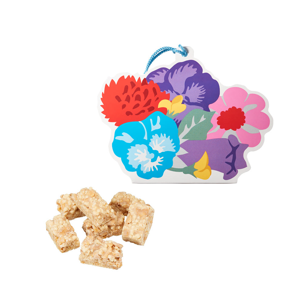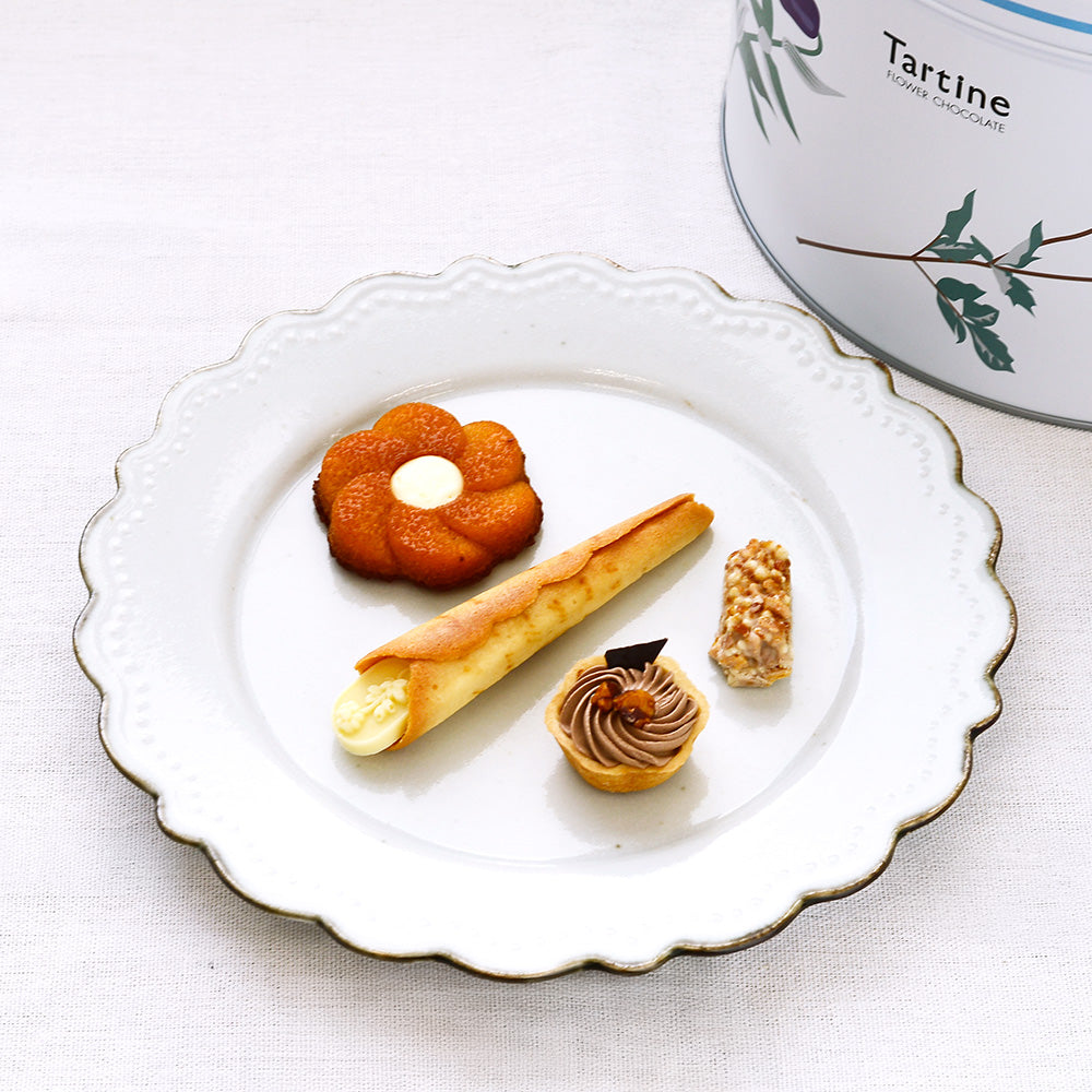 フランス産発酵バターを使用した香り高いラングドシャ生地で、ホワイトチョコクリームとアーモンドを包み、花柄のチョコレートを飾りました。