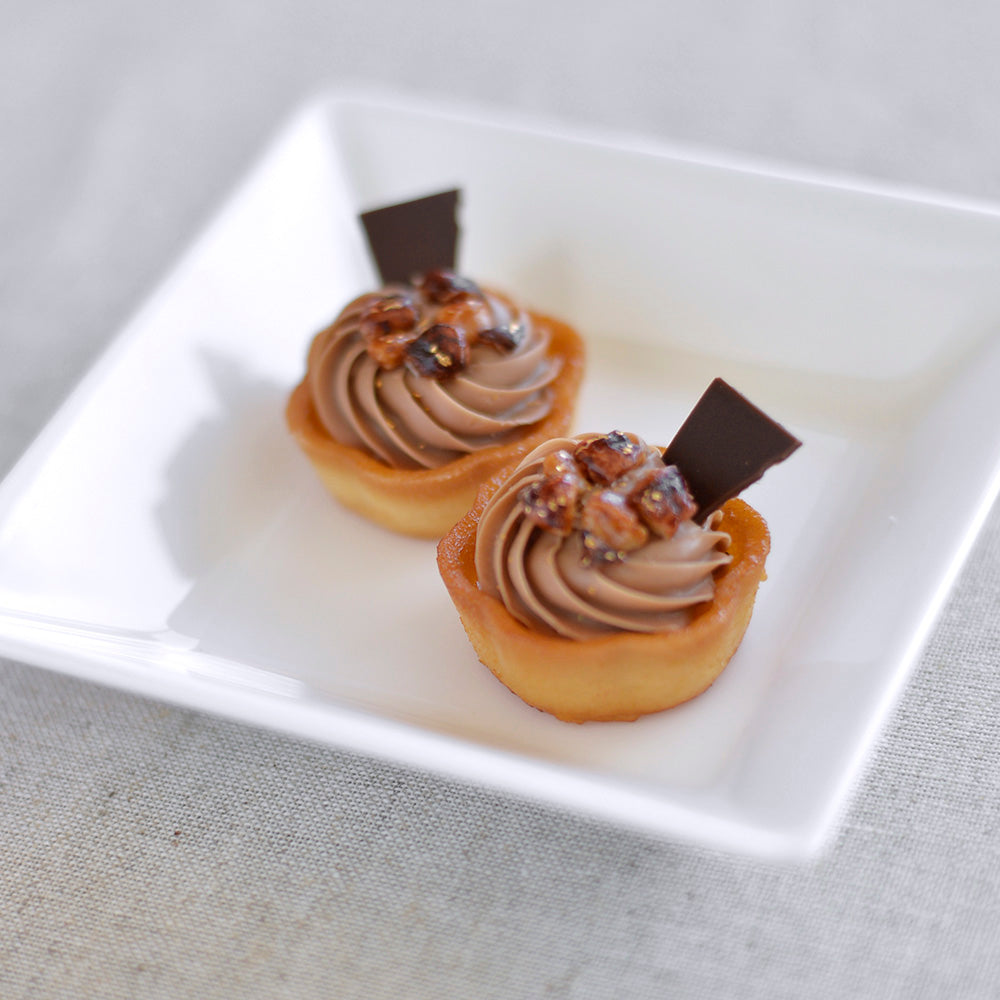 サクサクのタルトにアーモンドのプラリネとプラリネチョコクリームを絞り、キャラメリゼしたアーモンドとチョコレートで飾りました。